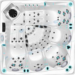 Для каждого места массажные форсунки установлены в индивидуальном порядке, благодаря чему осуществляется воздействие на разные проблемные зоны шеи, спины, икр ног. В конструкции бассейна предусмотрено 33 водных форсунки, их дополняет 10 воздушных форсунок. Силу потока воды каждый пользователь может регулировать для своего места индивидуально.